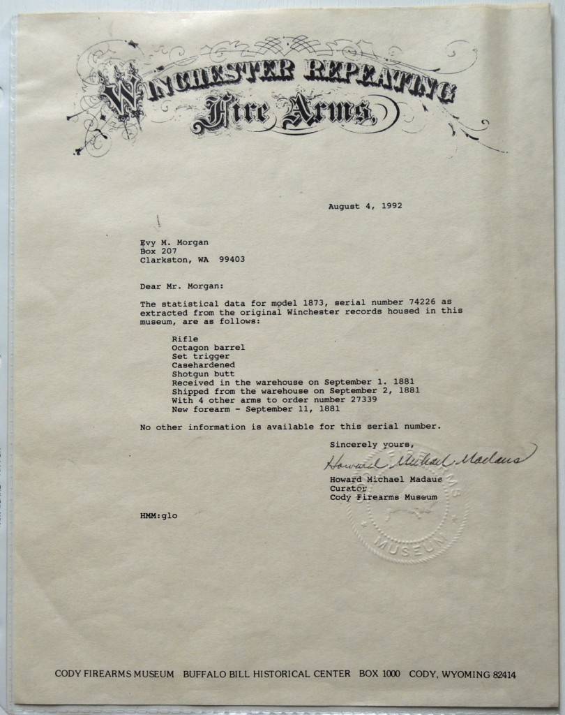 zvláštní výbava: napínáček spouště, shotgun botka, 26″ hlaveň, certifikát Cody Museum)