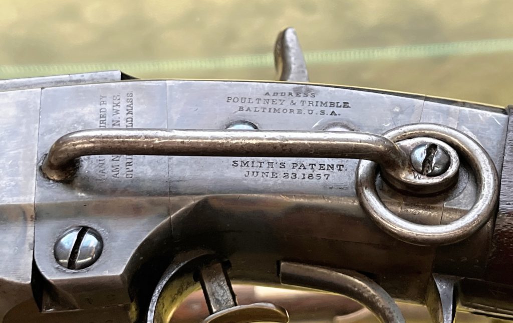 | signatura na rámu | ADDRESS/POULTNEY & TRIMBLE/BALTIMORE U.S.ASMITH’S PATENT/JUNE 23 1857 MANUFACTURED BY/AM’N M’CH’N WKS/SPRING… |