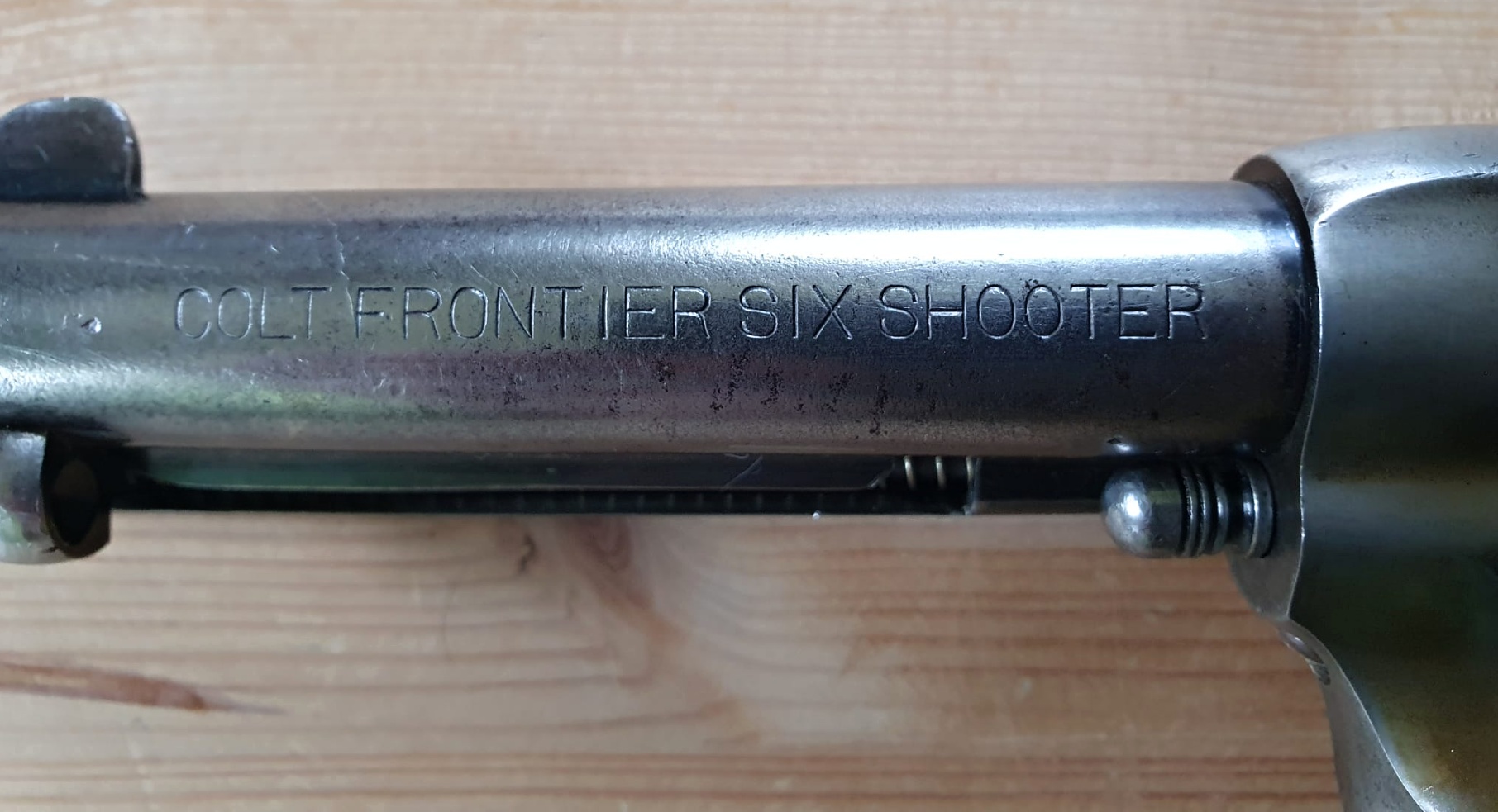 Signatury na zbrani hluboké, na hlavni nápis FRONTIER SIX SHOOTER.