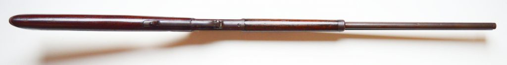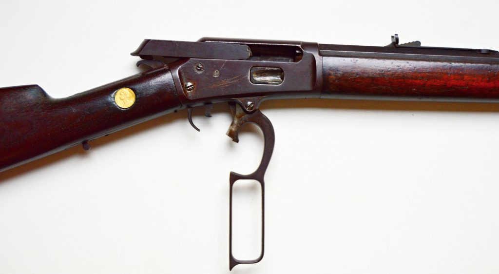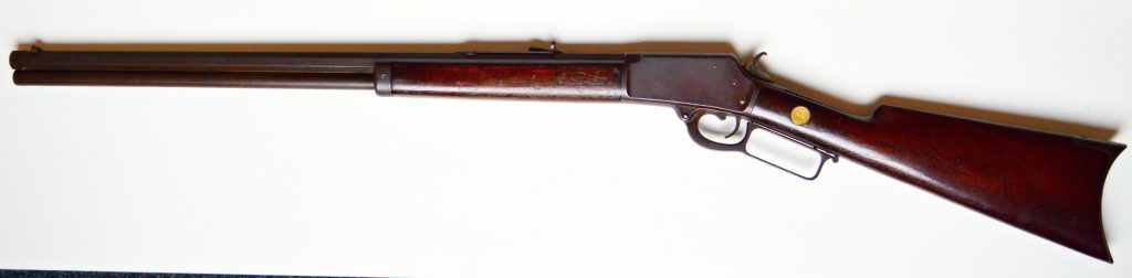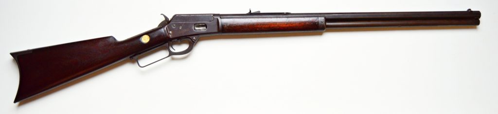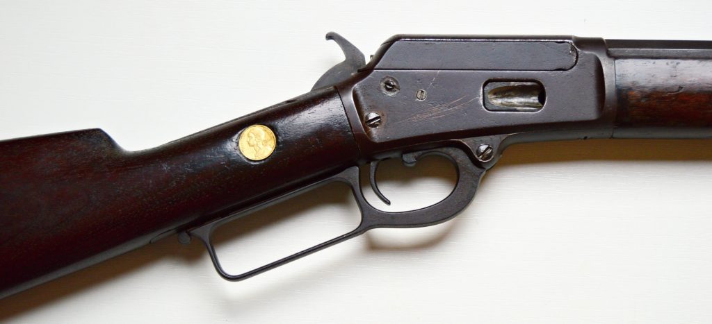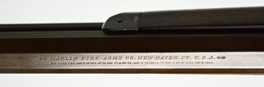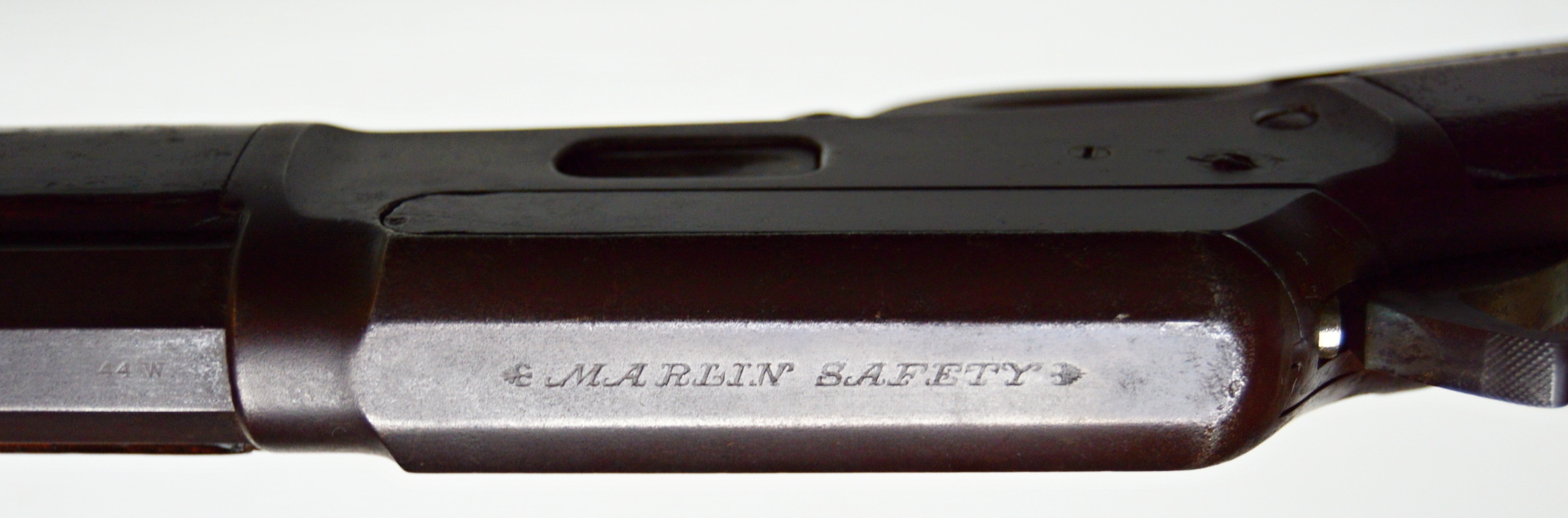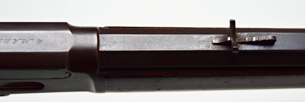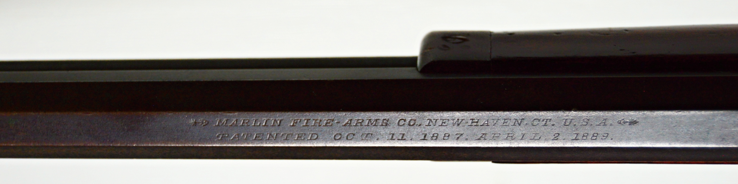 Marlin model 1889 Rifle v kalibru 44-40 Na octagonal hlavni a závěru je 100% čitelná, hluboká a kompletní signatura, včetně označení kalibru. Drážky v hlavni jsou viditelné, ostré, cca 75/100. Kov je 130 let stará patina. Dřevo je celkem zachovalé, na zápěstí je vsazená mince ze žlutého kovu. Hlaveň dlouhá 24″. Trubicový zásobník na 12 nábojů. Puška je funkční a střelbyschopná.