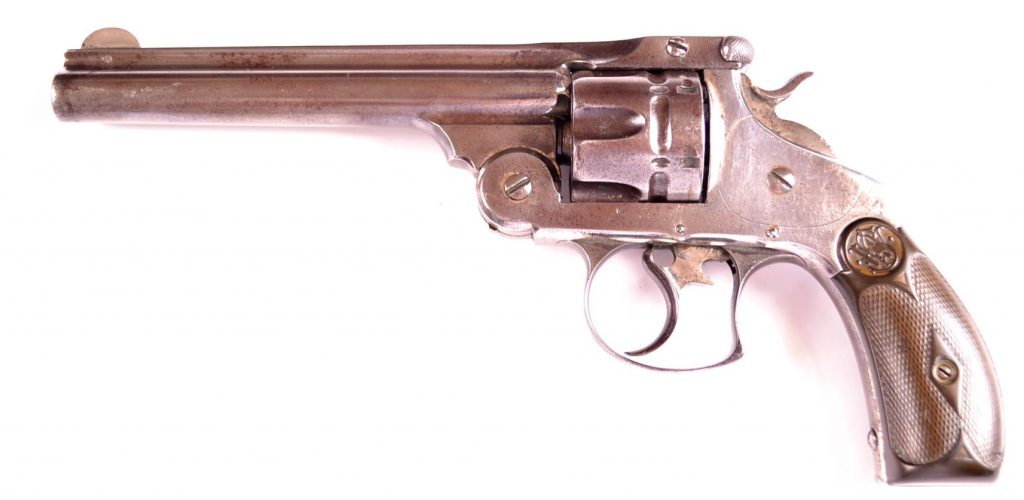 Smith & Wesson Second Model, vyráběn v letech 1881-1913 cal. 44 Russian Jedná se o dvoučinný šesti raný revolver se sklopnou hlavní. Signatury na hlavni perfektně čitelné, výrobní čísla na rámu i válci jsou shodné, střenky originální 100% stav. Na revolveru je nový nickel. Mechanicky je zbraň funkční, drážky v 4″ hlavni ostré, zřetelné. Nábojnice se prodávají dodnes.