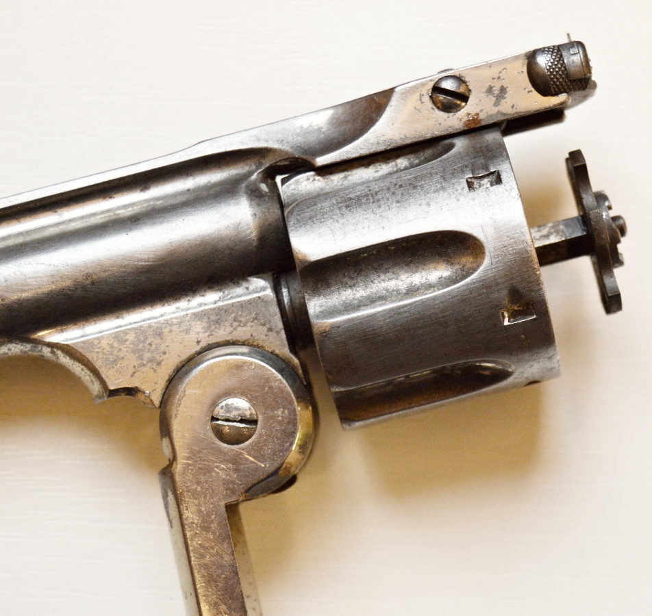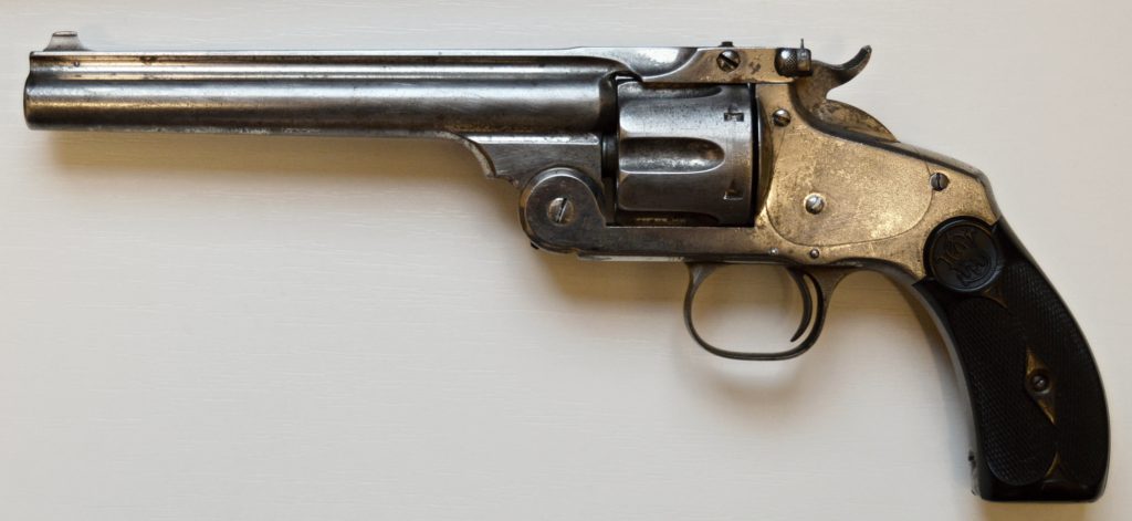 Tento revolver má 6 a1/2″ dlouhou hlaveň, povrchová úprava je nickel, který se místy zachoval. Revolver je funkční, adresa na hlavni a výrobní číslo je 100% čitelné. Střenky jsou pěkné. Vývrt má zřetelné drážky. Pěkný, masivní jednočinný revolver.