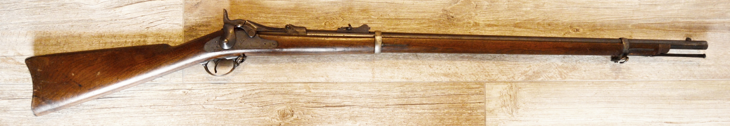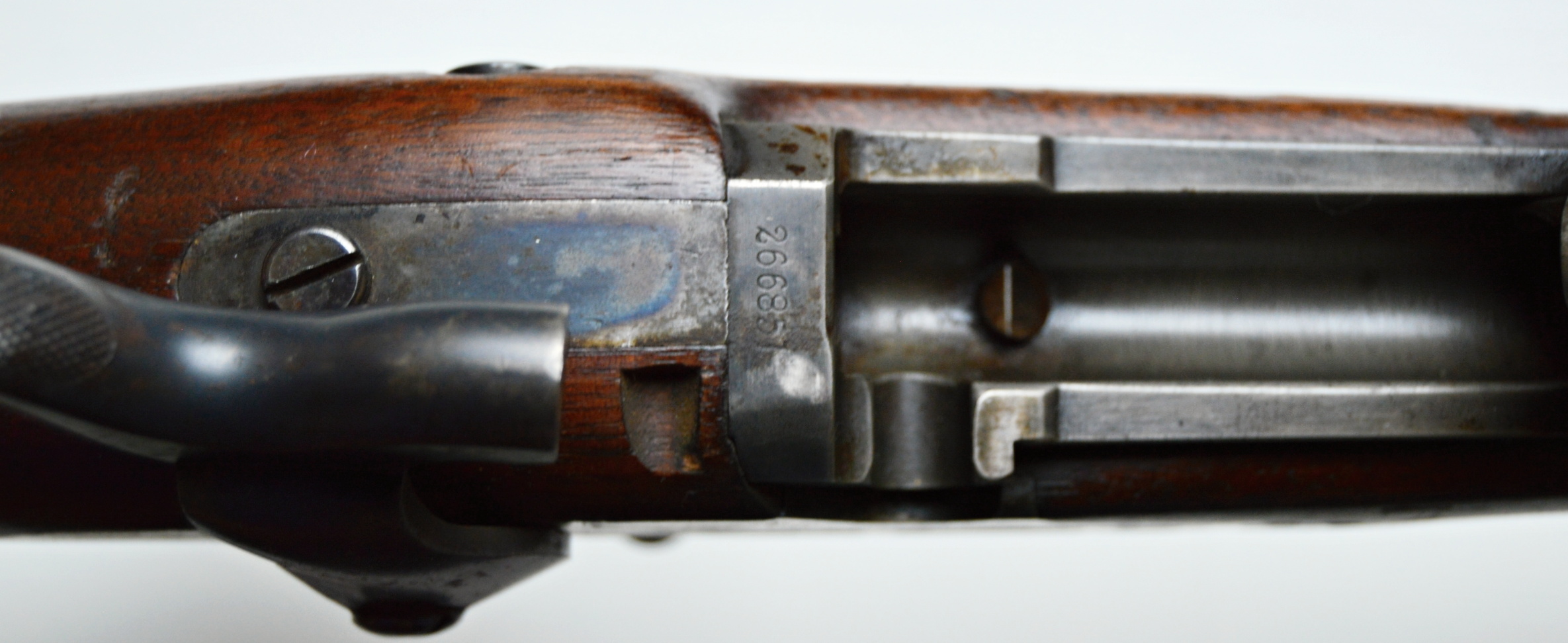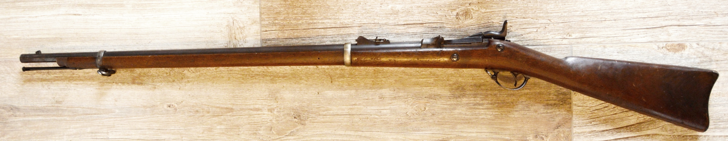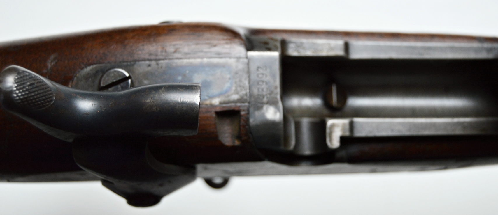 Springfield Trapdoor Rifle cal. 45-70. Jedna z nejoblíbenějších pěchotních US pušek. Hlaveň dlouhá 32″, signatury na zámkové desce a na závěru 100%. Na pažbě je patrná a dobře viditelná kartuš. Na závěru pušky je dobře zachovalé kalení. Vnitřek hlavně je ve velice dobrém a čistém stavu 80/100. Pažba je až na malé „oťuky“ ve vynikajícím stavu.