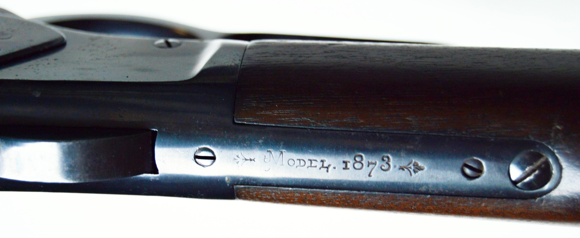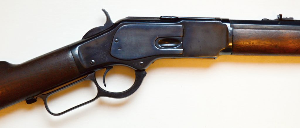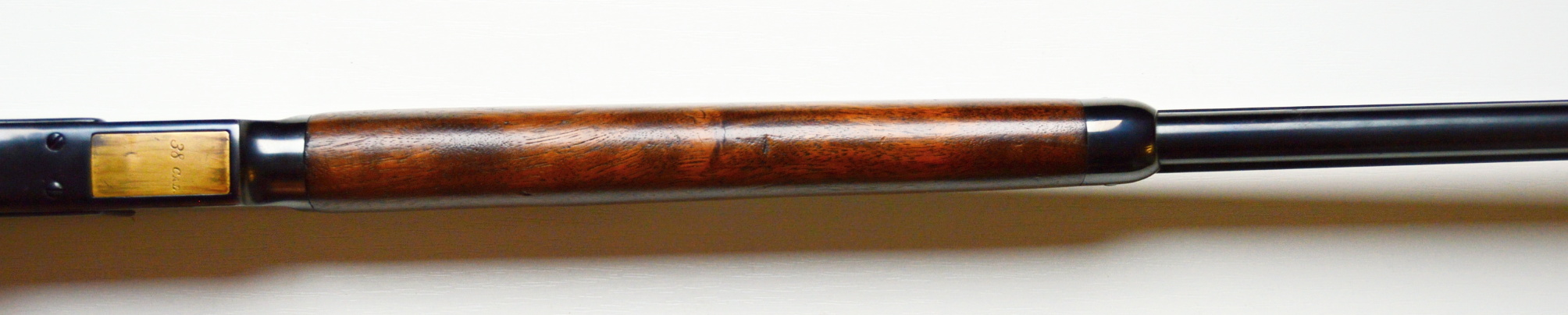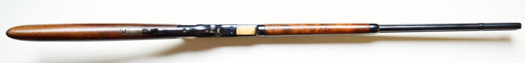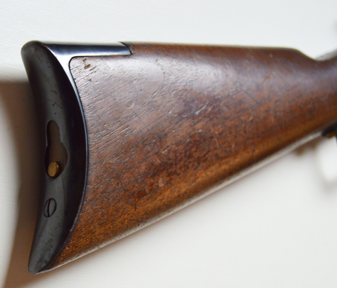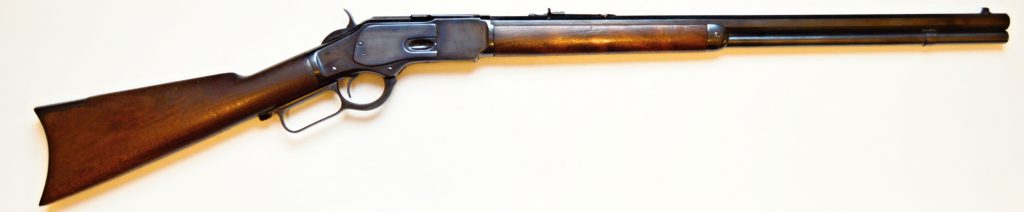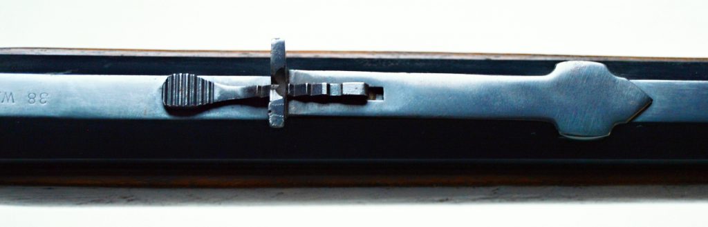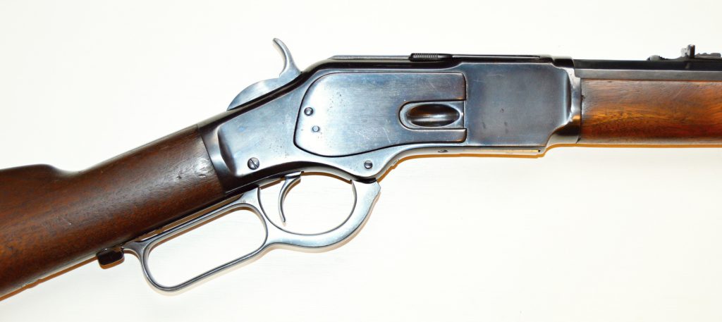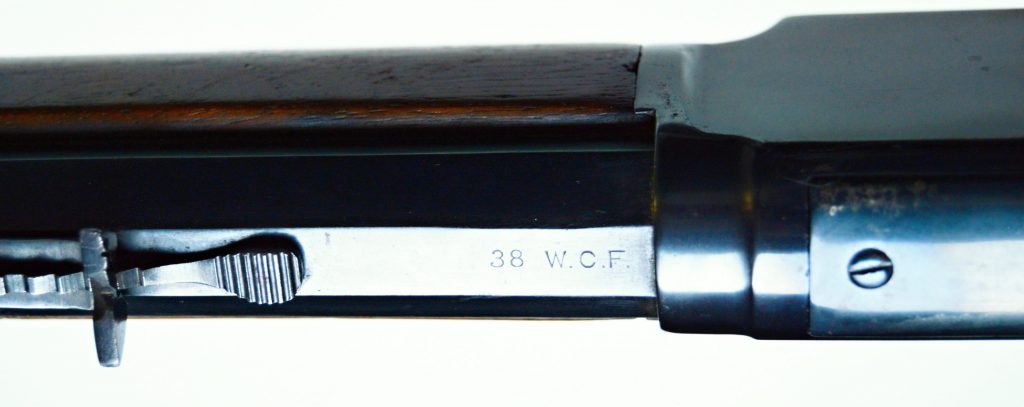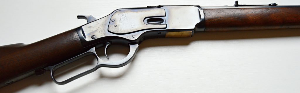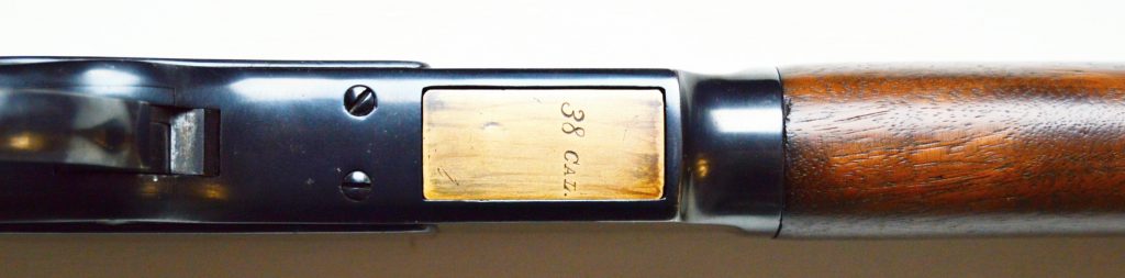Rifle Winchester 1873 cal. 38-40,. . Hlaveň octagonal dlouhá 24″ má perfektní signaturu, drážky v hlavni jsou ostré, lesklé a hluboké. Odhad je 85/100. Kovové části zbraně mají ostré hrany a jsou bez rzi. Dřevo je perfektní. Originál mířidla. Mosazný „výtah“ je nepoškozený, včetně čitelné kalibrace, Puška je plně funkční, podává, vyhazuje, střílí. Prachová krytka se po natažení páky sama odsune. Zbraň je po mechanické i vizuální stránce velice pěkná. Hlavy šroubů neožvýkané… Patenty na hlavni, označení modelu a výrobní číslo, vše je 100% krásně čitelné.