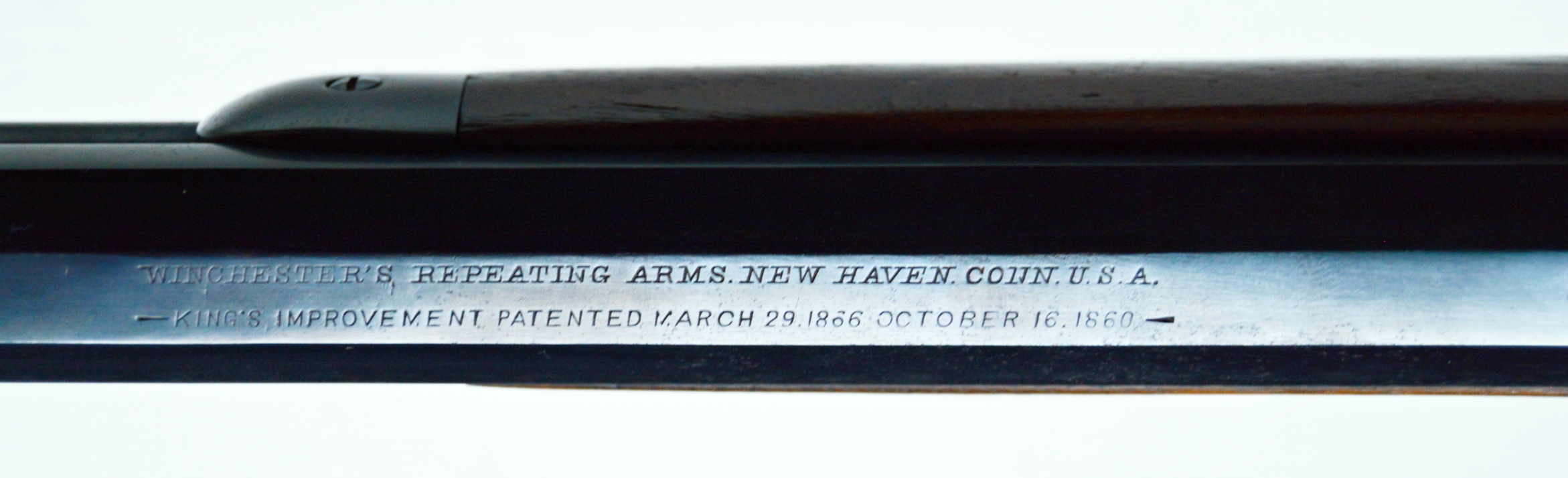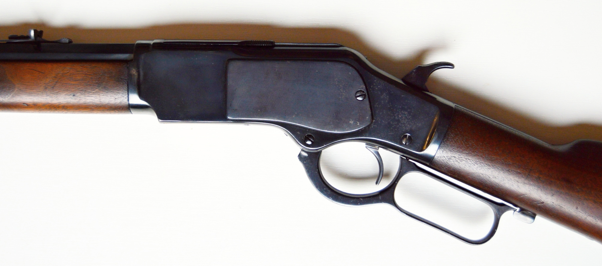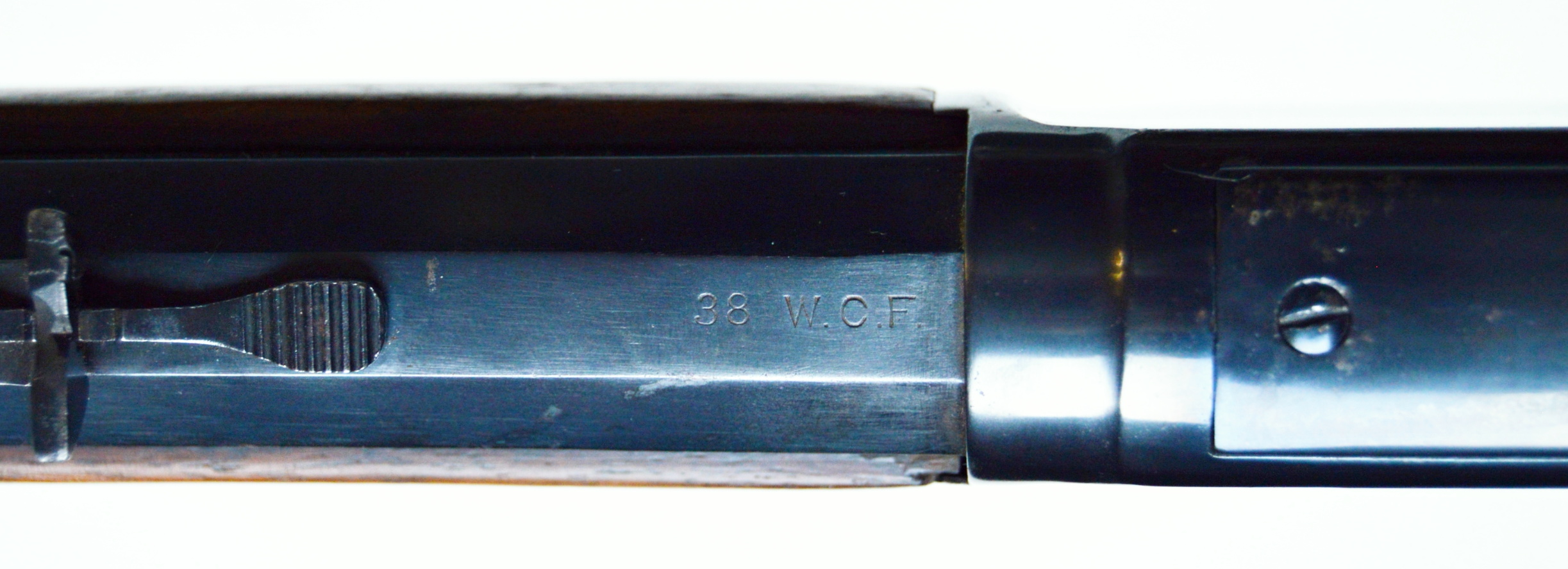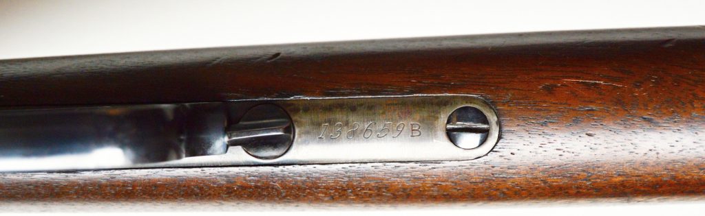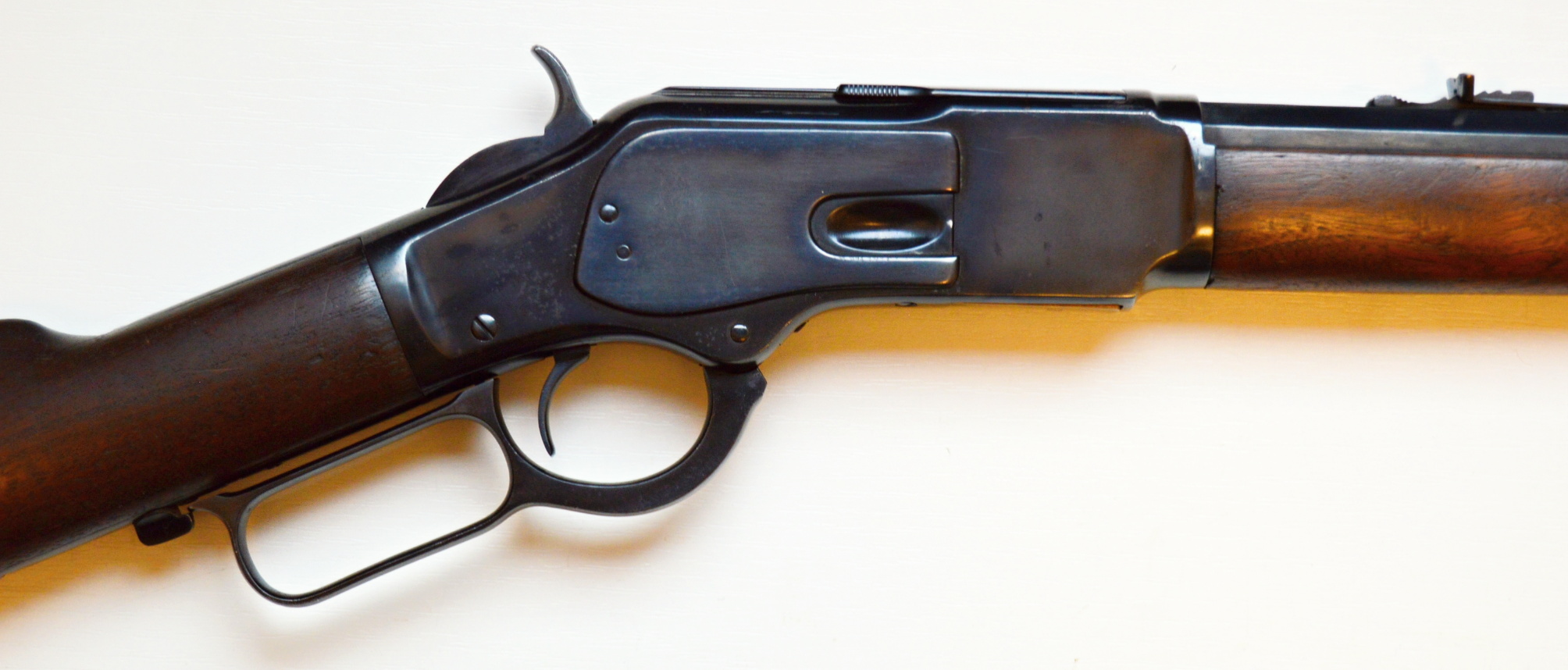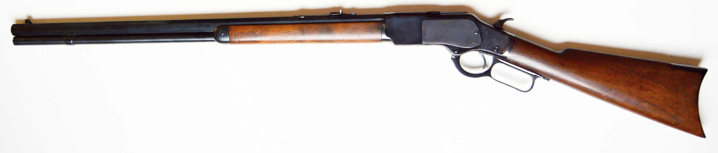 Rifle Winchester 1873 cal. 38-40,. . Hlaveň octagonal dlouhá 24″ má perfektní signaturu, drážky v hlavni jsou ostré, lesklé a hluboké. Odhad je 85/100. Kovové části zbraně mají ostré hrany a jsou bez rzi. Dřevo je perfektní. Originál mířidla. Mosazný „výtah“ je nepoškozený, včetně čitelné kalibrace, Puška je plně funkční, podává, vyhazuje, střílí. Prachová krytka se po natažení páky sama odsune. Zbraň je po mechanické i vizuální stránce velice pěkná. Hlavy šroubů neožvýkané… Patenty na hlavni, označení modelu a výrobní číslo, vše je 100% krásně čitelné.